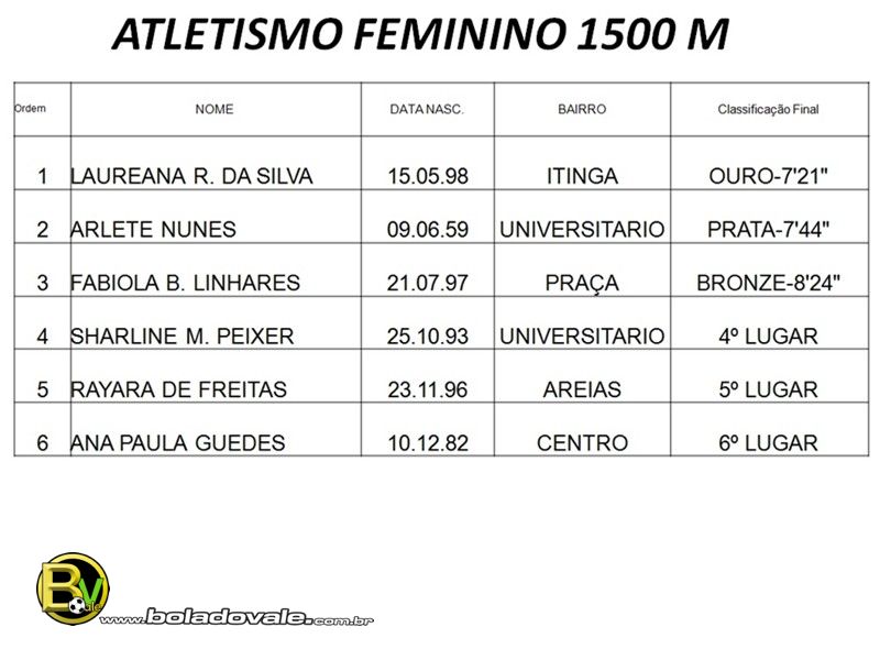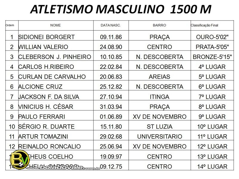 Já na prova dos 1500 metros livres do atletismo da XI Olimpíadas Tijuquense 2014, realizado na tarde deste ultimo domingo (9) de fevereiro no complexo esportivo da ADEC, a medalha de ouro do naipe feminino ficou com a atleta Laureana R. da Silva do bairro da Itinga com o tempo de 7’21. A prata ficou com a atleta Arlete Nunes do bairro Universitário com o tempo de 7’44 e o bronze com a atleta Fabíola Linhares do bairro da Praça com o tempo 8’24. No total foram seis atletas participando da prova. Já no naipe masculino quatorze atletas participaram da prova. O ouro ficou com o atleta Sidionei Borgert (Maringá) do bairro da Praça com o tempo de 5’02. A prata ficou com o atleta Willian Valério (Wiilian Cafu) do bairro Centro com o tempo de 5’05 e o bronze ficou com o atleta Cleberson J. Pinheiro do bairro de Nova Descoberta que terminou a prova com o tempo de 5’15. Confira a classificação completa da prova abaixo e o vídeo.
