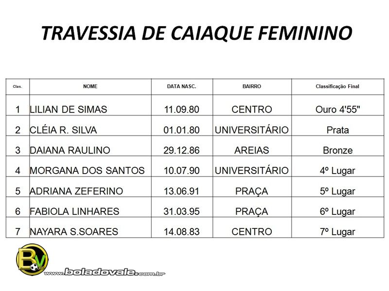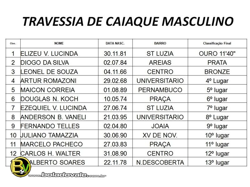 Na manha deste ultimo domingo (9) de fevereiro aconteceram às provas da travessia de caiaque nos naipes masculino e feminino da XI Olimpíadas Tijuquense 2014. A prova foi realizada no Rio Tijucas próximo ao dinossauro. Com sete atletas disputando no naipe feminino, a medalha de ouro ficou com a atleta Lilian de Simas do bairro Centro que terminou a prova com o tempo de 4’55. Já a prata Cléia R. Silva do bairro Universitário e o bronze com a atleta Daiana Raulino do bairro de Areias. No naipe Masculino que contou com a participação de treze atletas, o ouro ficou com Elizeu Lucinda do bairro de Santa Luzia que terminou a prova com o tempo de 11’40. A prata ficou com o atleta Diogo da Silva do bairro Areias e o bronze com o atleta Leonel de Souza do bairro Centro. Confira abaixo a classificação geral das provas. Fotos Anderson de Castro.